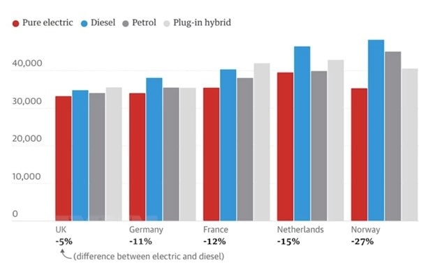 Vị này dẫn nghiên cứu của Hội đồng quốc tế về giao thông sạch (ICCT) tại Na Uy, Đức, Pháp, Anh và Hà Lan trong 4 năm đã chỉ ra, chi phí với xe điện thấp hơn đáng kể (lên tới 27%) so với các loại xe chạy bằng xăng, dầu và cả các loại xe "lai" sử dụng cả xăng cả điện.