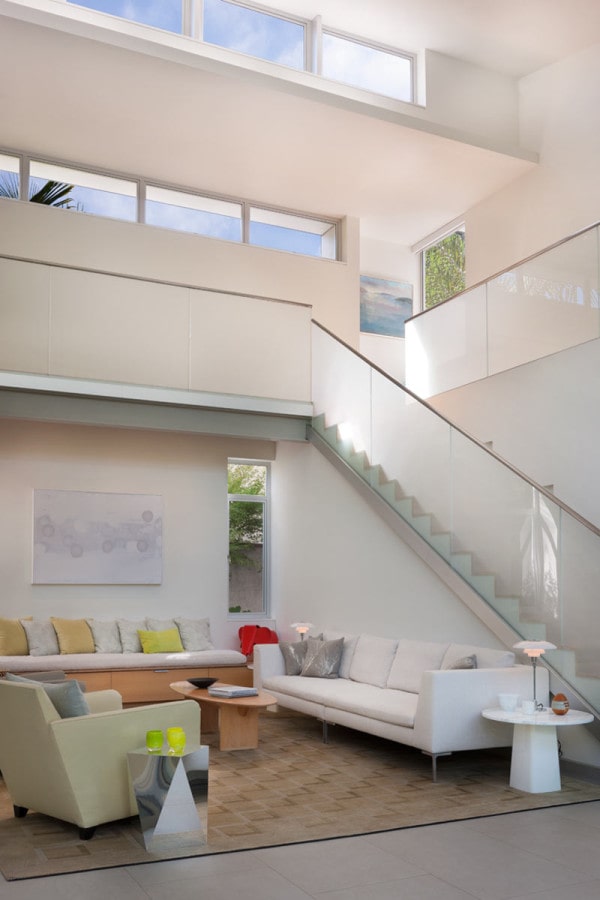 Phòng cao và rộng nhất trong ngôi nhà được đặt làm phòng khách. Trần nhà cao kết hợp với nhiều cửa sổ giúp tận dụng tối đa ánh sáng ban ngày.