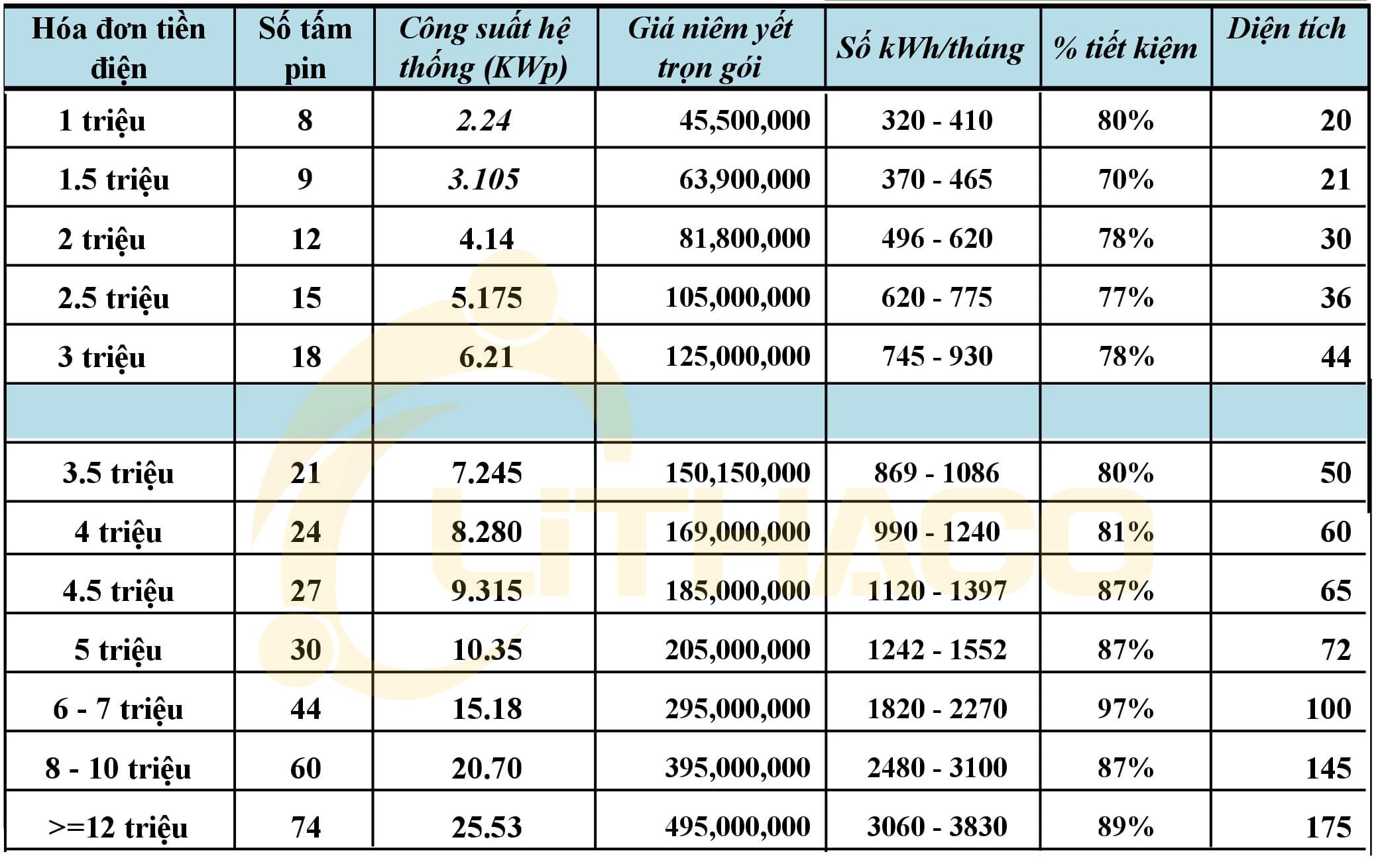 16 January, 2019 04:19 PMChào Anh @ Đoàn văn hùng. Giá thành tùy vào công suất sử dụng của gia đình mình nhé ( Vd nếu gia đình sử dụng khoảng 1 triệu tiền điện/ tháng thì nên lắp hệ 3KWP với giá trọn gói 71 triệu, hiện Lithaco đang giảm 10% còn 63 triệu và giảm thêm 7% nếu thanh toán sớm).