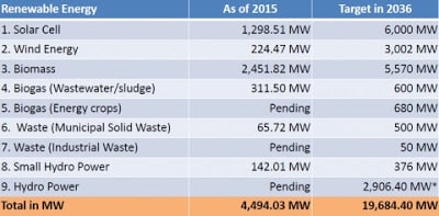 Bảng 1: Kế hoạch phát triển năng lượng tái tạo cho Thái Lan trong giai đoạn 2015-2036. (Nguồn: Năng lượng tái tạo Industries Club, Liên đoàn Công nghiệp Thái Lan FTI, ngày 25 tháng 3 năm 2016 )