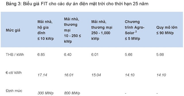 [2] Biểu giá Chương trình Agro-Solar được áp dụng cho các dự án <=5MW, có hệ số công suất dưới 16%, phải có ít nhất 1 cơ quan nhà nước hoặc hợp tác xã nông nghiệp tham gia đầu tư theo hình thức công tư (PPP). Nếu dự án có hệ số công suất cao hơn thì phần tăng thêm được trả theo giá bán buôn 12 tháng trung bình của EGAT, mà được tính toán lại mỗi bốn tháng.